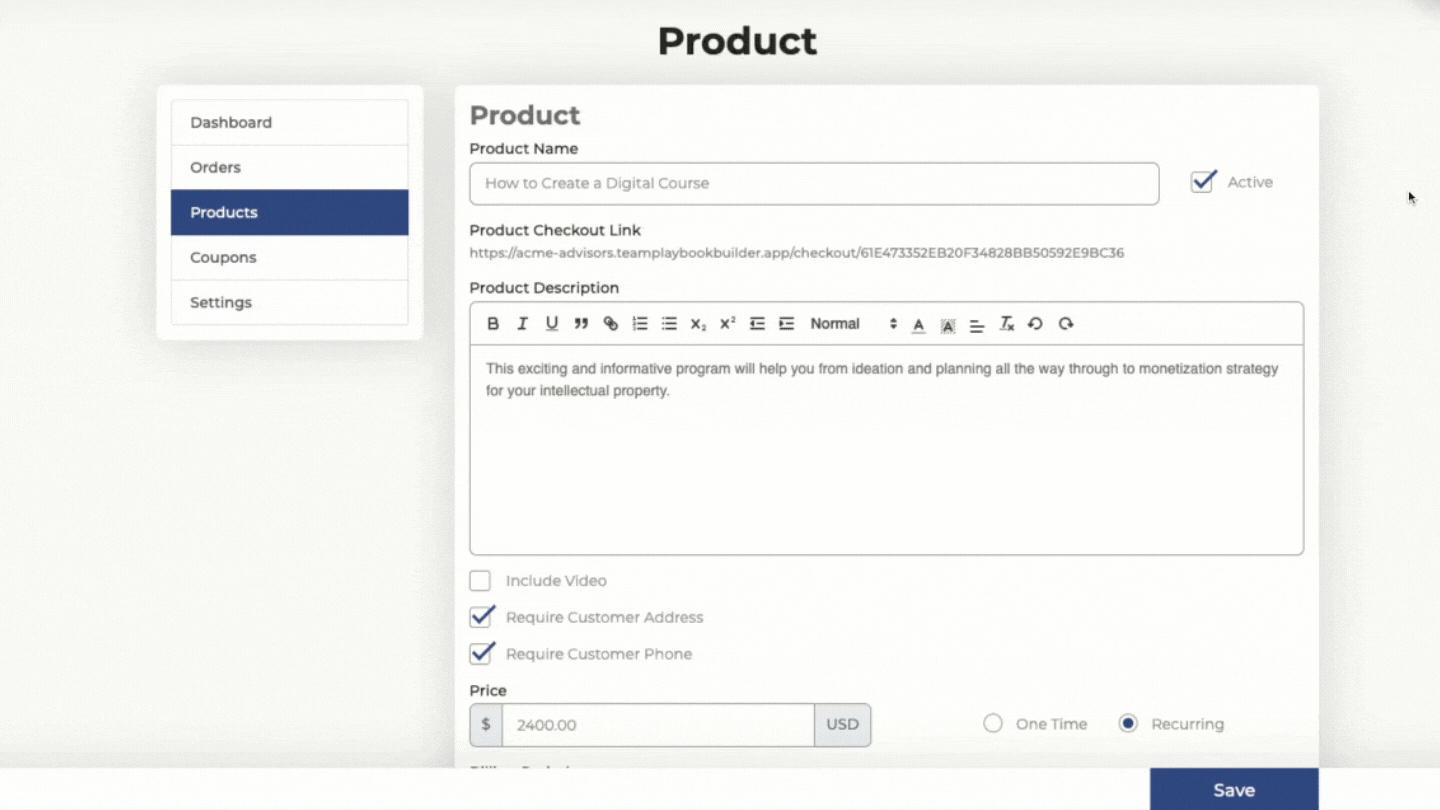 PlaybookBuilder enables content creators to build, share, and charge for their content. Our powerful payment features allow you to build product landing pages, set your pricing model, add coupons and track payments. For some entrepreneurs, what they know is so valuable they could charge for it. And with PlaybookBuilder, they do. Have a course or program? Do you have tools that you share with your clients that really resonate? Maybe it’s time to scale with a new model. PlaybookBuilder helps top tier professionals to open a new revenue stream in their business by licensing their intellectual property to others in their industry. Build a playbook for your team and then charge others to access it. “PlaybookBuilder has completely changed the business that I run. With it, I am able to scale my operation simply and easily while being on the go almost constantly.” Charge for Content