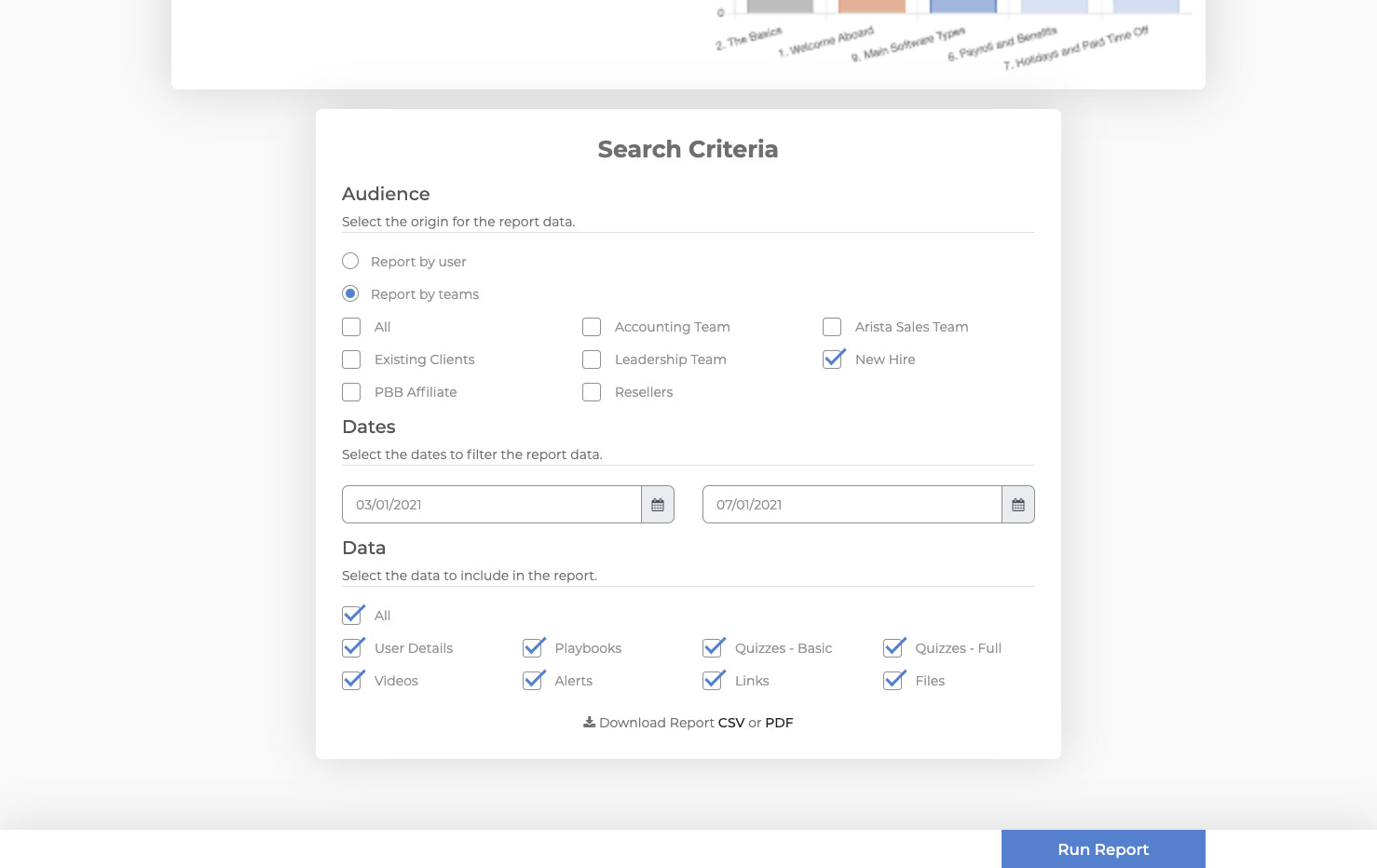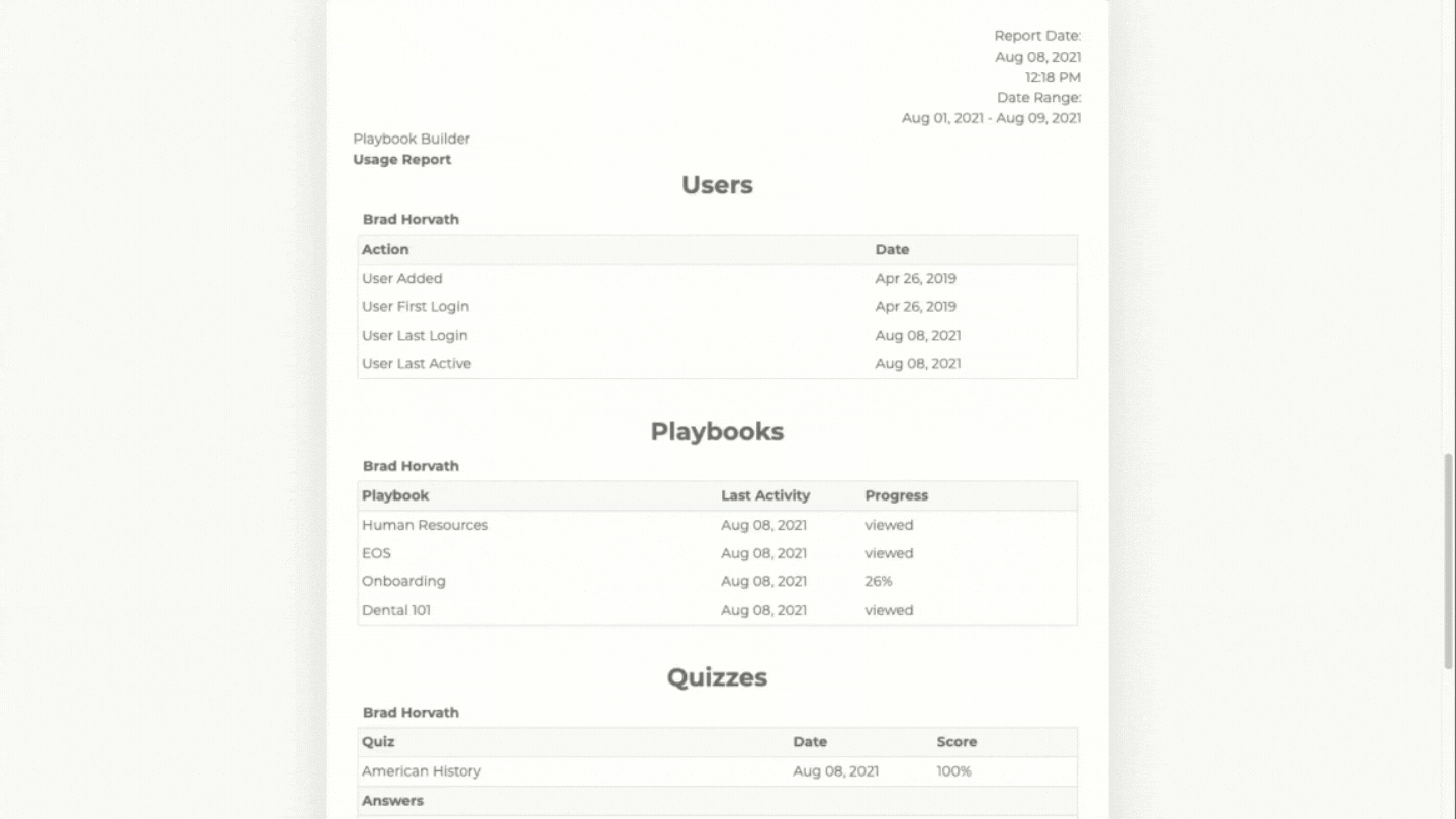 PlaybookBuilder helps the people who are leading change with robust reporting. Now can see what content your team are consuming, when, and how frequently. The overview portion on the reports page lets you see the behavior of the whole community in a single look. It’s like taking the pulse on your team’s training. Want to know how a single user is doing? Single user reports enable you to see specific user behavior like recent activity, quiz scores, videos watched, percent completion, frequency, and most recent date watched. Want to know how your New Hires are doing? Or how frequently your Leadership Team are using the software? Pick a team and run a report to know the details. Reports